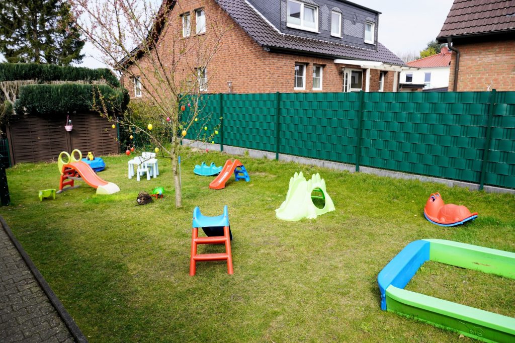 Im Garten können die Kinder sich auf den verschiedenen Rutschen und Spielzeugen austoben. Im Schuppen befinden sich zusätzlich Laufräder, Dreiräder und Bobbycars, die bei Bedarf herausgeholt werden können.